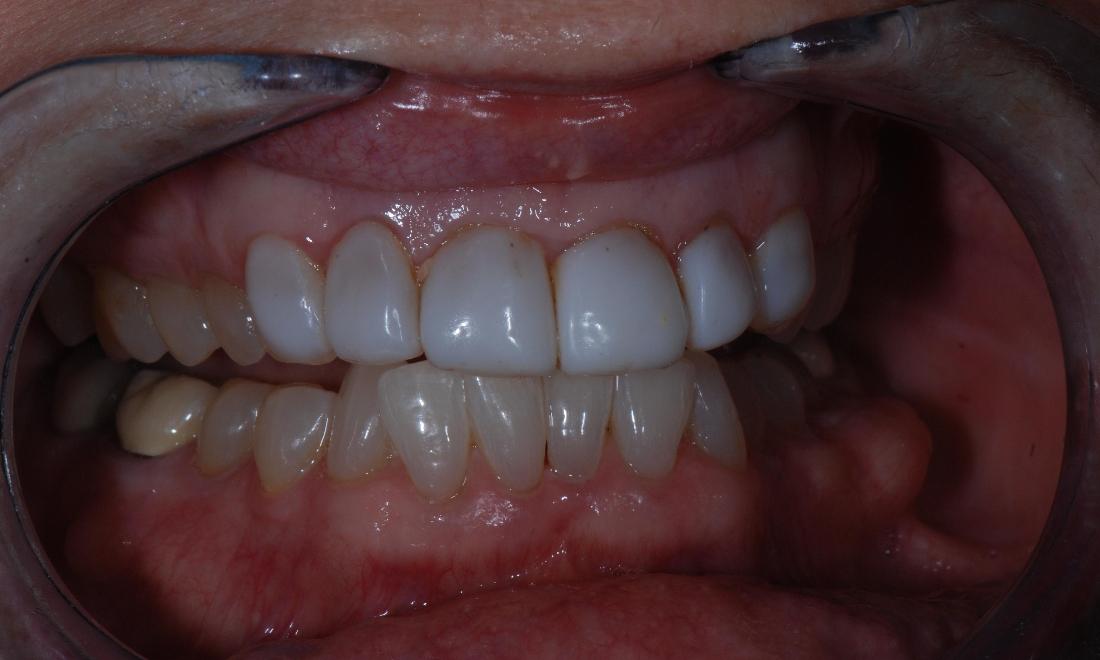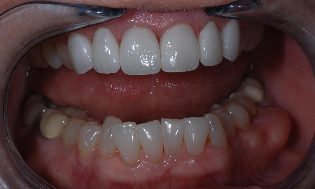 This patient had old composite veneers that were staining and chipping, resulting in an irregular look to her front teeth. We removed the old materials and replaced them with ceramic veneers that would last decades longer and be more esthetic.